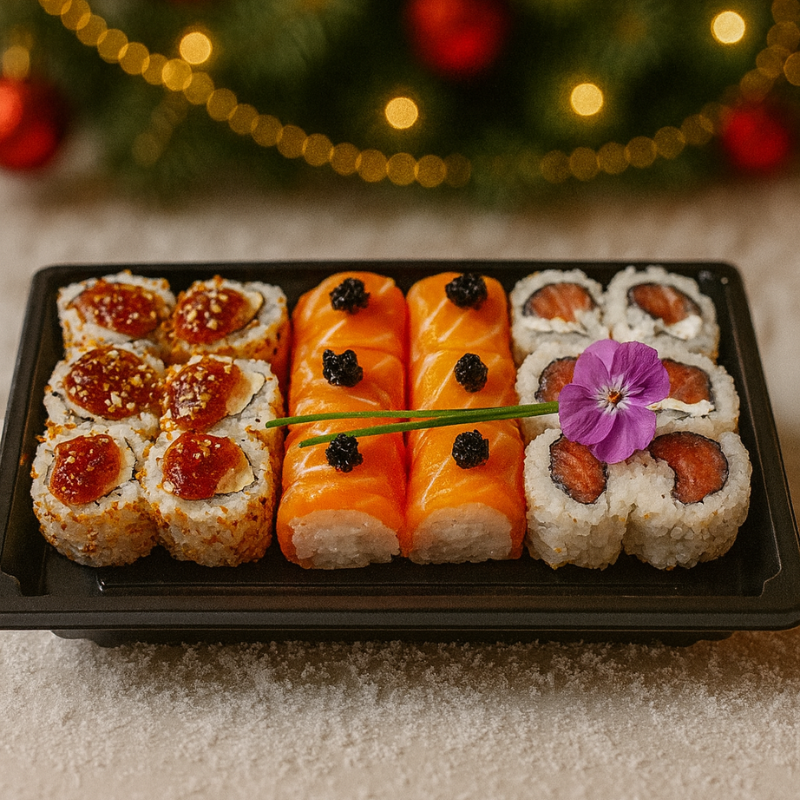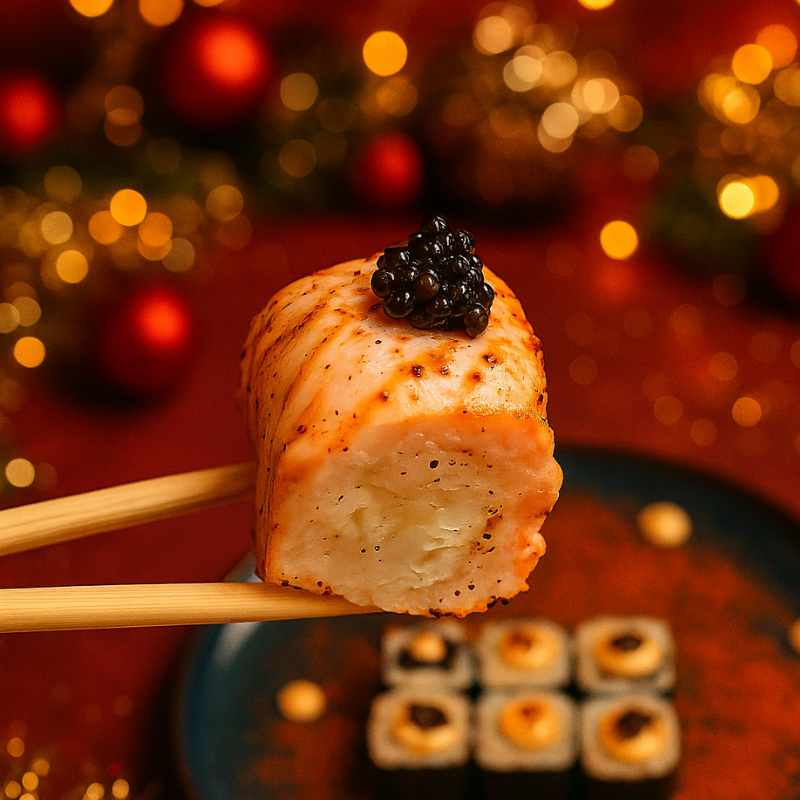 Un California roll généreux au saumon fumé fondant, cream cheese, aneth, mayonnaise japonaise légèrement spicy et touche de truffe pour une création gourmande et raffinée, spécialement imaginée pour les fêtes de fin d’année.