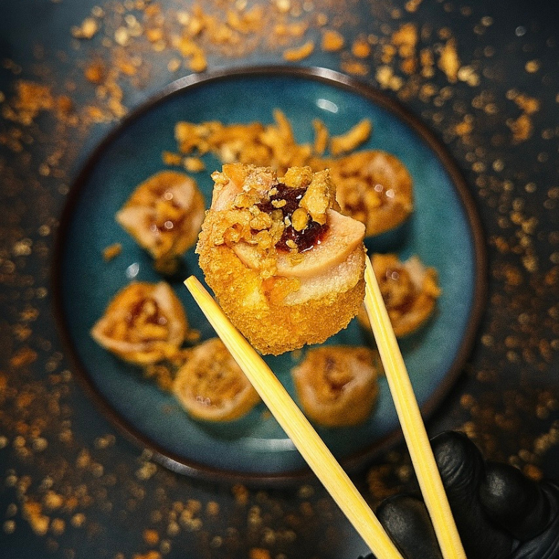 Un roll chaud ultra gourmand : riz frit croustillant, foie gras fondant, confiture de figue sucrée, éclats de praline croquants, oignons frits dorés et un filet de sauce teriyaki caramélisée… une bouchée festive, riche et irrésistible.
