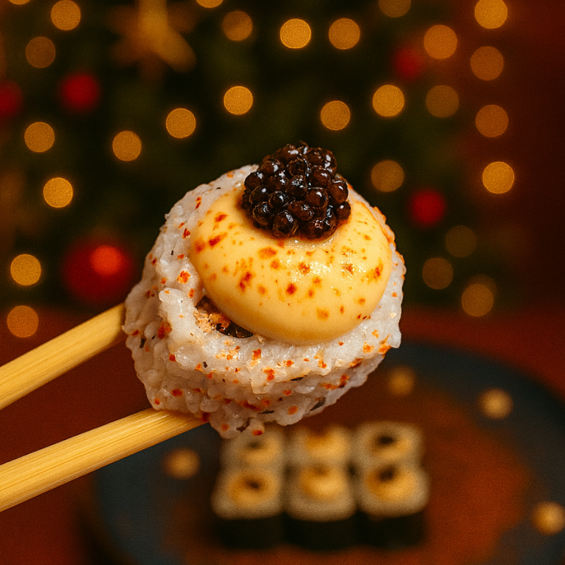 Un cœur fondant de cream cheese enrobé de riz vinaigré, entouré de saumon snacké au 7 épices et sublimé par une touche de truffe… une création raffinée pensée spécialement pour les fêtes de fin d’année.